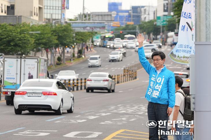 이석문 제주도교육감 후보가 24일 노형로터리에서 지지를 호소하고 있다. 사진=이석문 후보 캠프
