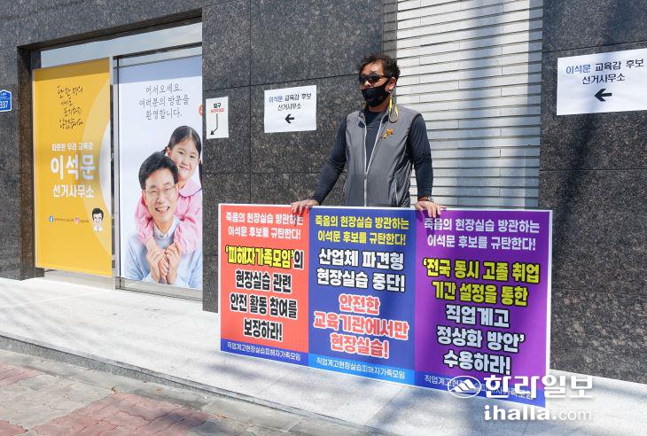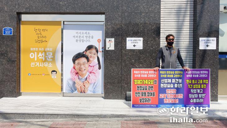 이상영 씨가 25일 제주시 노형동 이석문 제주도교육감 후보 사무실 앞에서 1인 시위를 벌이고 있다. 김도영기자