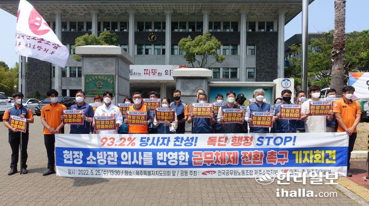 공무원노조 제주소방지부가 25일 제주도의회 앞에서 3조1교대 전면 시행을 촉구하는 기자회견을 열고 있다. 김도영기자