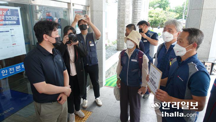 기자회견을 마친 공무원노조 제주소방지부가 제주소방안전본부를 찾아 항의서한을 전달하고 있다. 김도영기자