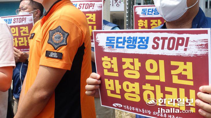 이에 대해 제주소방안전본부는 같은 날 설명자료를 내고 "소방안전본부가 노조의 의사를 전면 수용하지 않고 있다는 것은 사실과 다르다"며 "소방안전본부는 교대근무방식 개선과 관련 각 소방서별 전 직원 의견 수렴과 소방관서장 검토회의 및 노사 실무회의 등 지속적인 의견 수렴 과정을 거쳤다"고 밝혔다.