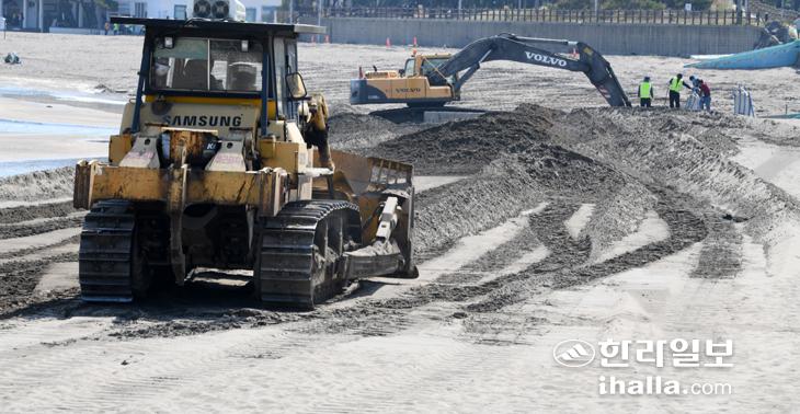 25일 제주시 이호동 이호해수욕장에서 중장비를 동원해 개장 준비가 한창이다. 강희만기자