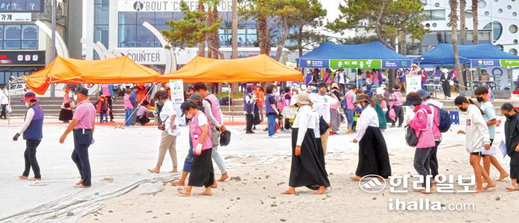 "다같이 다함께 지구를 살리자" 행사가 원불교 제주교구 주최로 29일 제주시 함덕해수욕장에서 열린 가운데 참가자들이 분리배출 교육 및 맨발걷기 체험을 하고 있다. 이상국기자