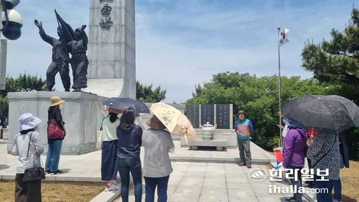 지난 28일 '2022 제주 항일운동 역사교육 직무연수' 참가자들이 조천만세동산 등 조천읍 일대 항일유적지를 답사하고 있다. 사진=제주도교육청