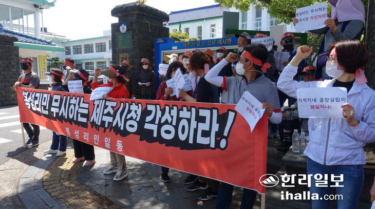 제주시 애월읍 봉성리 주민들이 31일 제주시청 앞에서 기자회견을 열고 공장 설립 반대 의견을 피력했다. 김도영기자