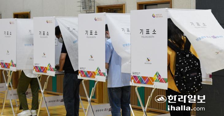 제8회 전국동시지방선거일인 1일 제주시 아라동 제5투표소에서 시민들이 한 표를 행사하고 있다. 이상국기자