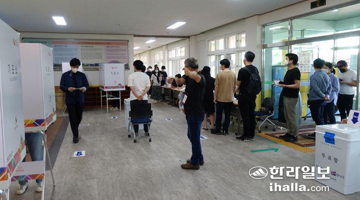 제주시 노형동 한라초등학교에 마련된 노형동 제4투표소에는 한 때 투표를 위해 방문한 선거인들의 줄이 길게 늘어서기도 했다.