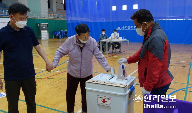 1일 한라중학교에 설치된 노형동 제5투표소를 찾은 어르신이 아들의 손을 꼭 잡고 투표용지를 투표함에 넣고 있다. 김도영기자