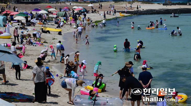 2일 제주시 한림읍 협재해수욕장에 많은 피서객들이 찾아 물놀이를 즐기고 있다. 강희만기자