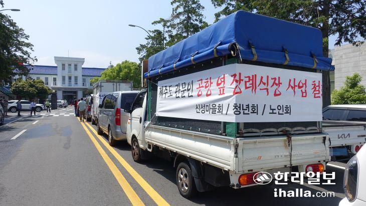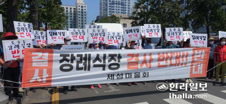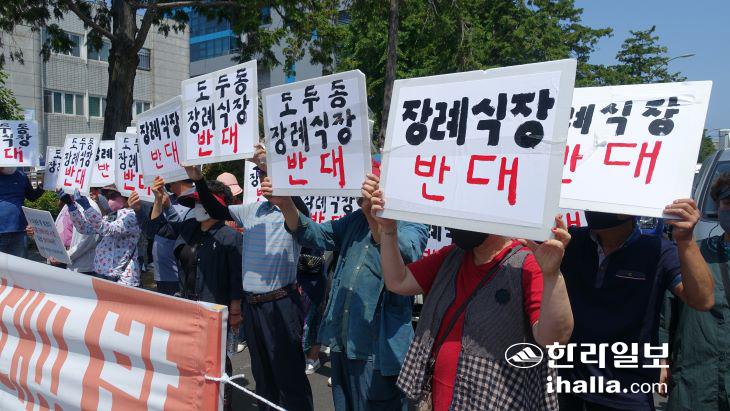 제주시 도두동 주민들과 인근 마을회, 오일장 상인회, 제주공항 주변 토지주 협의회 등으로 구성된 '도두동 장례식장 반대위'(이하 장례식장 반대위)는 3일 제주시청 앞에서 기자회견을 열고 "제주의 관문인 제주국제공항 옆에 장례식장을 허가해 준 제주시와 부정하게 주민들의 찬성을 종용해 찬성 명부를 거짓으로 작성한 다호마을 회장과 임원진을 도민사회에 알린다"고 말했다.