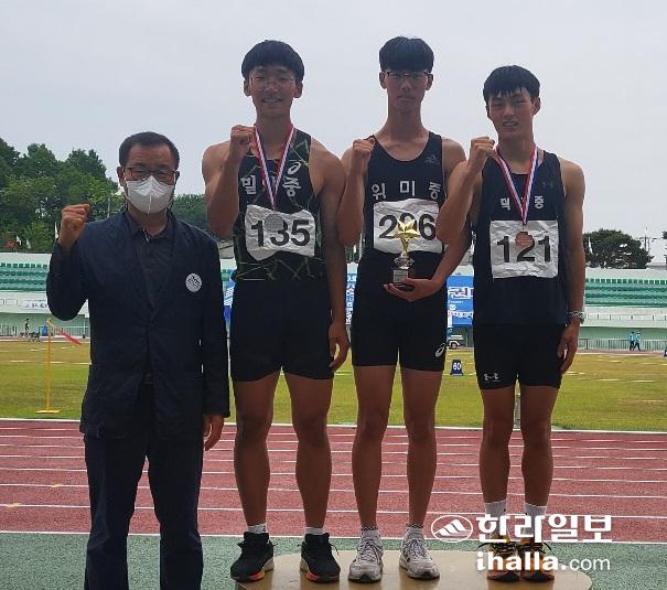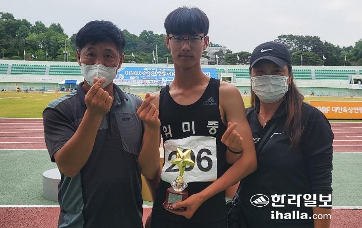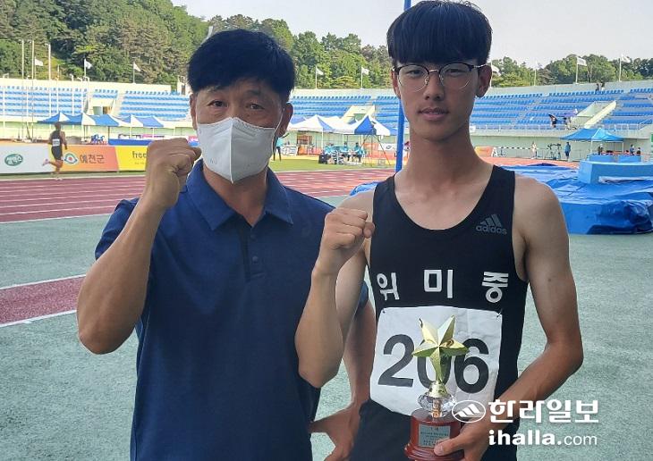4일 경북 예천군 예천공설운동장 육상경기장에서 열린 제50회 KBS배전국육상경기대회 남중부 400m에서 1위로 골인하며 금메달을 목에 건 김홍유.