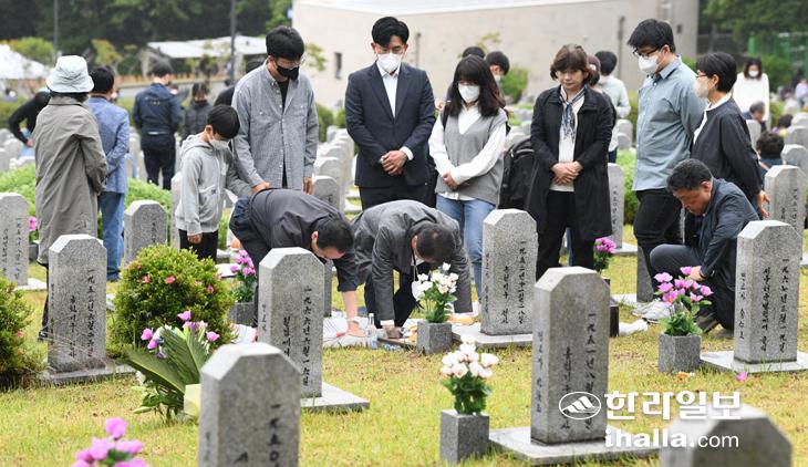 제67회 현충일인 6일 제주시 충혼묘지를 찾은 유족들이 묘비 앞에서 제를 지내며 나라를 위해 목숨을 바친 순국선열과 호국영령의 명복을 빌고 있다. 강희만기자