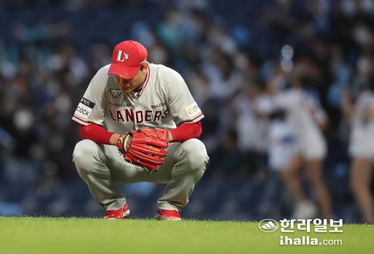 7일 경남 창원NC파크에서 열린 '2022 신한은행 쏠(SOL) KBO 리그' NC 다이노스와 SSG 랜더스 경기. 2회 말 실책 등으로 5실점 한 SSG 선발 김광현이 그라운드에 앉아 있다. 연합뉴스