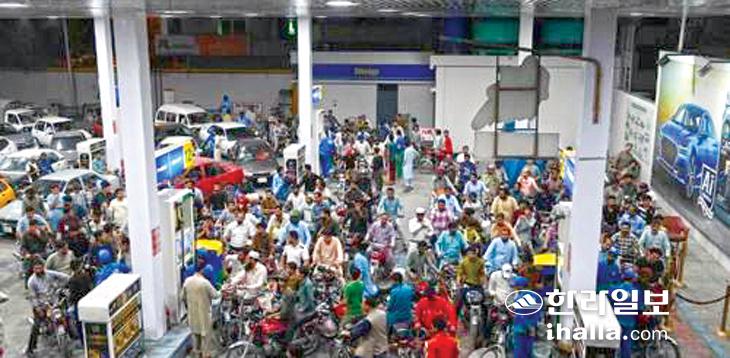 기름을 넣기 위한 줄이 늘어선 파키스탄 이슬라마바드의 한 주유소. 연합뉴스