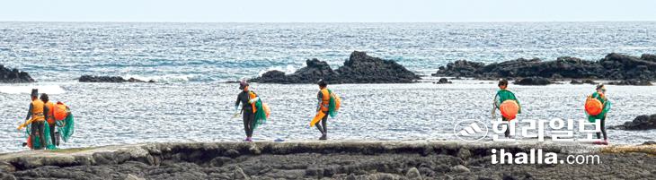 8일 제주시 구좌읍 김녕리 해녀들이 물질을 하기 위해 김녕바다로 나가고 있다. 강희만기자