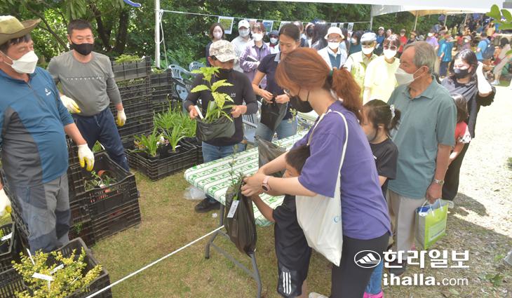 지난 11일 서귀포시 이중섭공원에서 열린 제11회 서귀포 봄맞이축제에서 현장을 찾은 시민들이 꽃나무 나눔 부스에 줄을 서서 나무를 받아가고 있다. 이상국기자