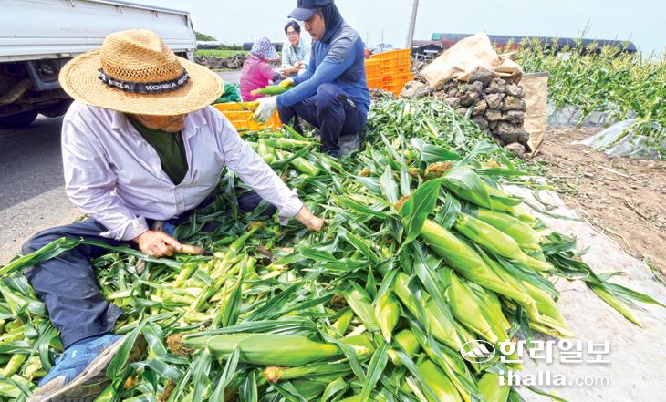 12일 제주시 한림읍 수원리의 한 밭에서 농민들이 갓 수확한 초당옥수수를 손질하고 있다. 강희만기자