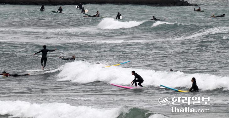 13일 제주시 구좌읍 월정해수욕장을 찾은 서퍼들이 밀려드는 높은 파도에 몸을 맡기며 서핑을 즐기고 있다. 강희만기자