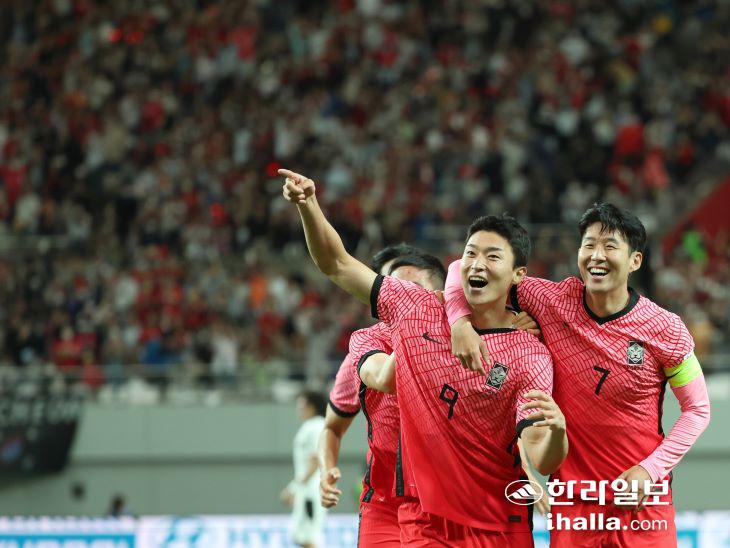 14일 오후 서울 마포구 서울월드컵경기장에서 열린 남자 축구 국가대표팀 친선경기 한국 대 이집트 경기에서 조규성(9번)이 골을 넣고 기뻐하고 있다. 연합뉴스