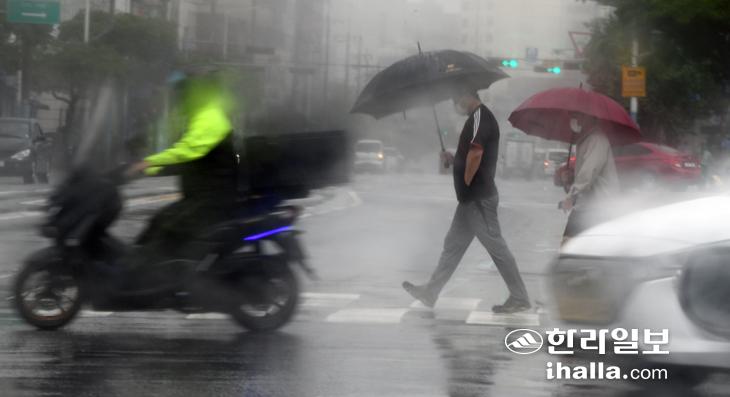 14일 제주전역에 많은 비가 내린 가운데 행인들이 제주시 광양로터리 횡단보도를 건너고 있다. 강희만기자