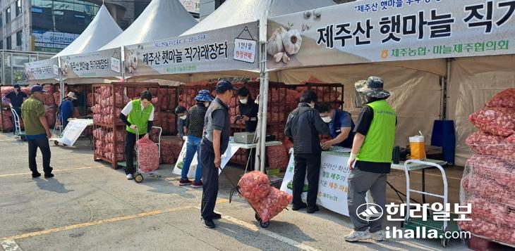 16일 제주시 농협중앙회 제주지역본부 주차장에서 제주산 햇마늘 직거래장터가 열린 가운데 시민들이 저렴한 가격에 마늘을 구입하고 있다. 이상국기자