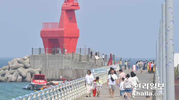 16일 제주시 이호테우해수욕장을 찾은 관광객들이 해수욕장 명물로 자리잡은 등대를 배경으로 기념사진을 찍으며 제주의 초여름을 만끽하고 있다. 이상국기자
