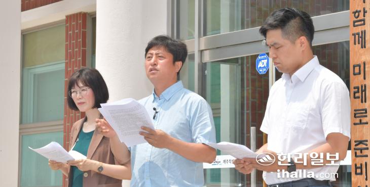 제주인권위원회가 16일 제주농어업인회관 앞에서 기자회견을 열고 "제주인권위원회의 기능과 역할을 마비시키고 인권 보장이라는 도지사의 사회적 책무를 방기한 데 대한 항의로서 동반 사퇴한다"고 밝히고 있다. 이상국기자