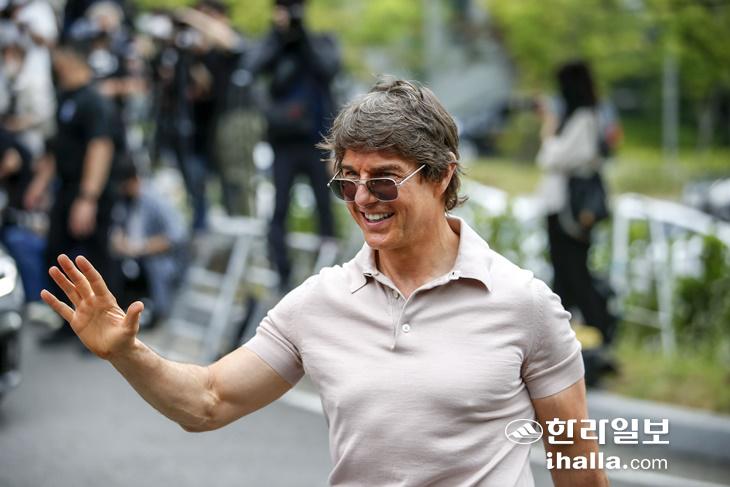 할리우드 배우 톰 크루즈가 신작 '탑건: 매버릭' 홍보차 17일 오후 서울 김포공항을 통해 입국한 뒤 팬들에게 인사하고 있다. 연합뉴스