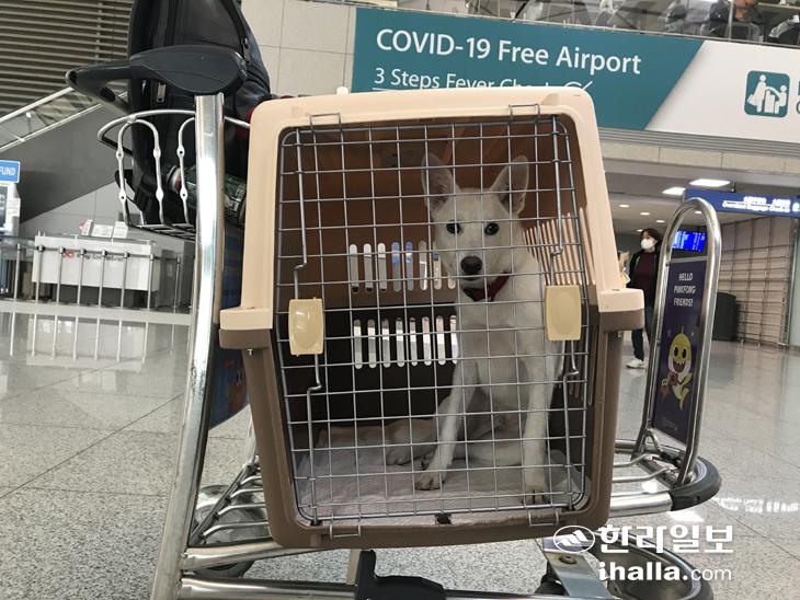 인천국제공항에서 미국 LA로 가는 비행기를 타기 위해 케이지에 담긴 세종이. 사진=제제프렌즈