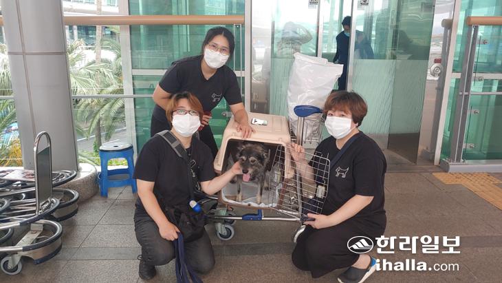 홍난영(맨 왼쪽) 대표 등 제제프랜즈가 2020년 7월 블랙이를 해외 입양 보내는 모습. 사진=제제프렌즈