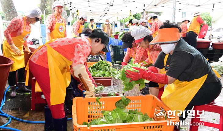 19일 청솔봉사회원들이 창립 60주년을 기념해 대한적십자사 제주도지사에서 관내 독거노인과 다문화가정에게 지원할 사랑의 김치만들기 행사를 가졌다. 강희만기자