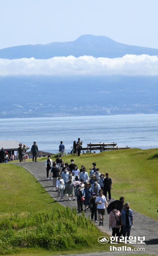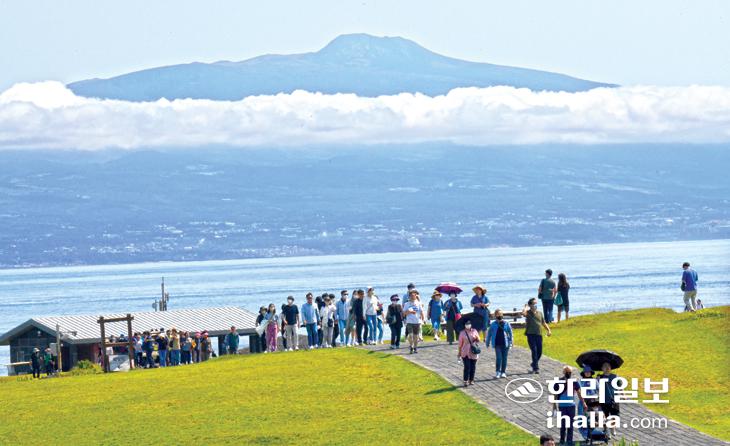 19일 국토최남단 마라도에서 바라본 한라산이 구름 사이로 자태를 드러내며 장관을 연출하고 있다. 강희만기자