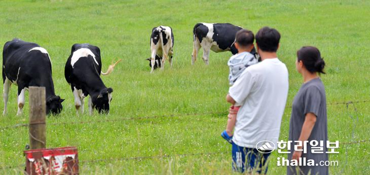20일 제주시 한림읍 이시돌목장을 찾은 관광객들이 초원에서 풀을 뜯고 있는 젖소들을 구경하고 있다. 이상국기자