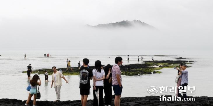 20일 제주시 협재해수욕장을 찾은 관광객들이 해무에 휩싸인 비양도 절경을 감상하고 있다. 이상국기자