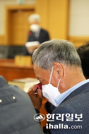 문성윤 변호사의 변론을 듣고 눈물을 흘리는 유족. 제주지방법원 출입 기자단.