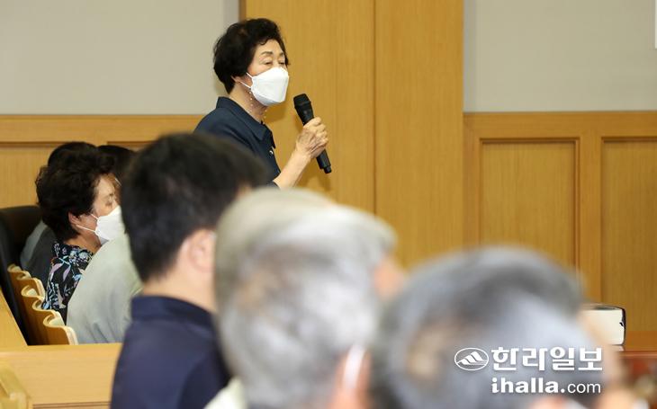 8살 때 아버지가 경찰에 구타 당하고 강제로 끌려가는 모습을 목도한 박희자씨가 80대 중반이 돼서야 법정에 서 증언하고 있다. 제주지방법원 출입 기자단.