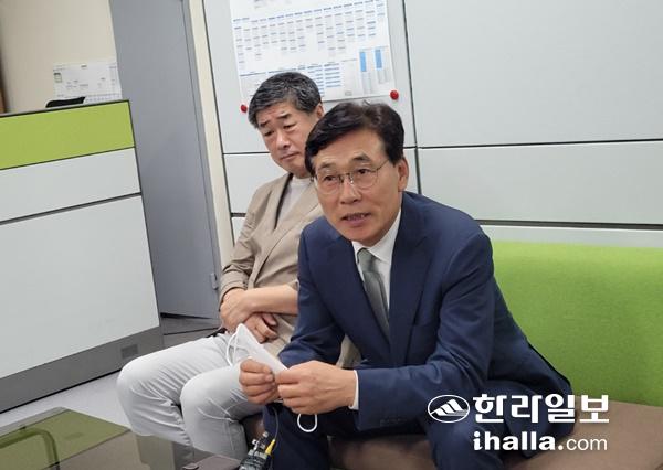 송석언 제주도지사직 인수위원장이 21일 제주도청 기자실을 찾아 간담회를 가졌다. 강다혜기자