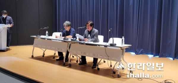 21일 제주문학관 4층 대강당에서 열린 '2023년 대한민국연극제 제주 유치 기념 세미나-대한민국연극제, 예술 창작의 마중물이 되다' 발제자로 나선 강용준 제주문학관 명예관장(맨 오른쪽)과 송시경 한국문화예술위원회 예술창작본부장. 오은지기자