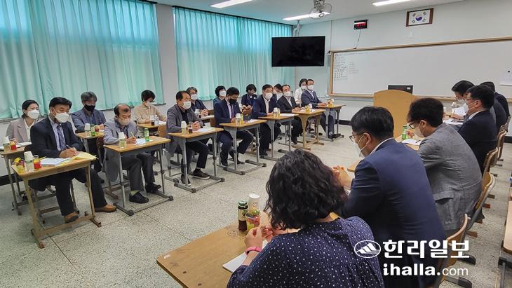 김광수 제주도교육감직인수위원회가 22일 체육학과를 운영하는 남녕고를 방문해 관련 현안들을 점검하고 의견을 수렴하고 있다. 사진=인수위원회 제공