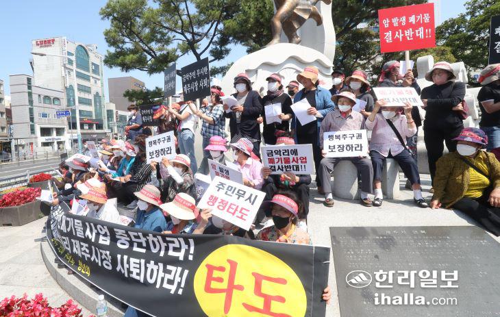 제주시 한림읍 금악리 주민들이 22일 제주시청 앞에서 폐기물 처리시설 반대 집회를 열고 있다. 김도영기자