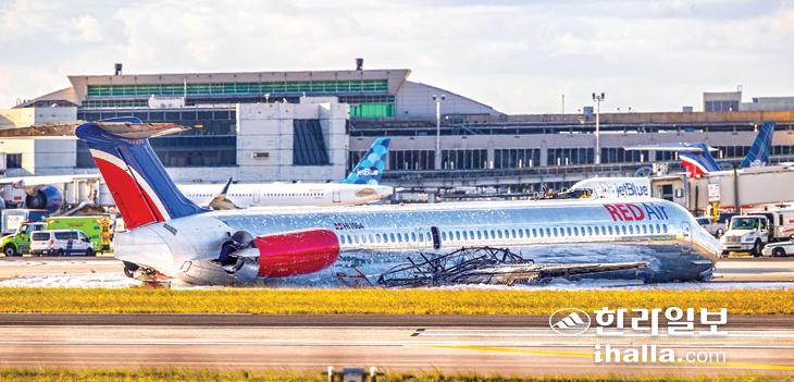마이애미 공항 착륙 중 화재 발생한 레드항공 여객기. 연합뉴스