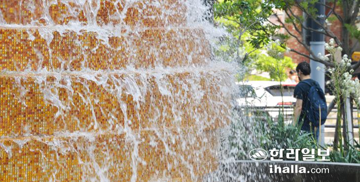 덥고 습한 날씨를 보인 22일 제주시 노형동 드림타워 앞 분수대에서 시원한 물줄기를 내뿜고 있다. 이상국기자