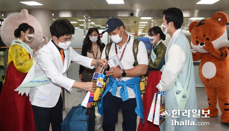 22일 오전 몽골 관광객 150여명이 전세기를 통해 제주를 찾았다. 이들은 이날부터 26일까지 4박5일간 도내 4개 종합병원에서 건강검진을 받는 한편 곶자왈, 허브동산 등을 방문하는 등 의료·웰니스 체험을 하게 된다. 이상국기자
