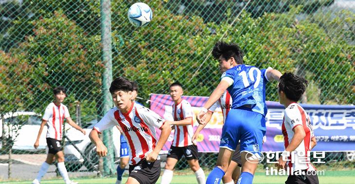22일 제주시 사라봉운동장에서 열린 제5회 제주도축구협회장기 전도축구대회 남고부 제주제일고와 중앙고의 경기에서 김동휘(제주제일고)가 헤더슛을 하고 있다. 강희만기자