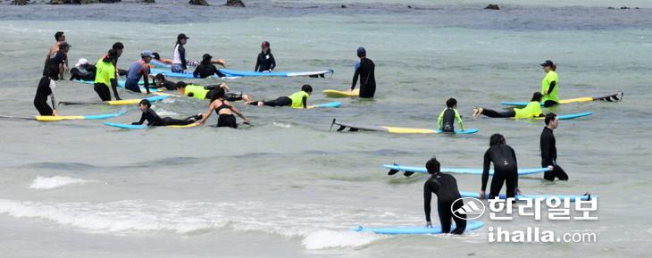 밤부터 장맛비가 예고된 23일 제주시 구좌읍 월정해수욕장을 찾은 피서객들이 물놀이를 즐기며 더위를 식히고 있다. 강희만기자