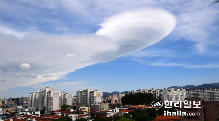 23일 제주시 상공에 '렌즈구름'이 떠올라 신비한 분위기를 자아내고 있다. 강희만기자