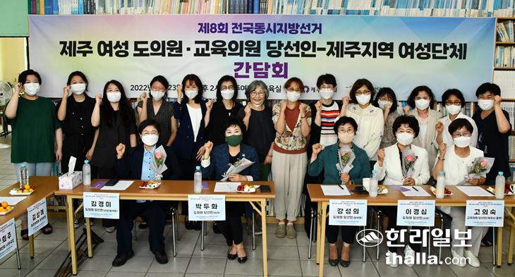 지난 23일 제주여민회 교육실에서 열린 6·1 지방선거 제주도의원, 교육의원 여성 당선인 간담회 참석자들이 기념 촬영을 하고 있다. 제주여민회 제공