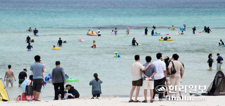지난 25일 제주시 한림읍 협재해수욕장을 찾은 피서객들이 물놀이를 즐기고 있다. 강희만기자