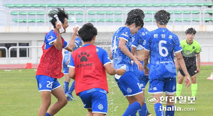 26일 제주종합경기장 주경기장에서 열린 제5회 제주도축구협회장기 전도축구대회 남고부 결승전에서 대기고를 3-2로 물리친 제주제일고 선수들이 물병의 물을 뿌리며 기쁨을 나누고 있다. 이상국 기자