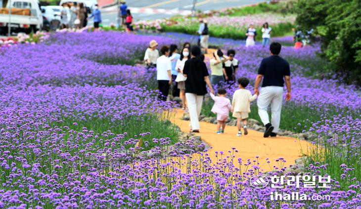 28일 제주시 이호동 공한지에 조성된 한 공원에 버베나꽃이 활작 피어 행인들의 눈길을 끌고 있다. 강희만기자